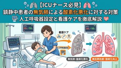 鎮静中で自発呼吸のない患者に無気肺が起こると酸素化が急速に悪化。PEEP増加・FiO₂調整・リクルートメント・体位変換・吸痰まで認定看護師しーちゃんがICU看護師向けに徹底解説。