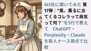 新人看護師に聞いてほしい フィジカルアセスメント AI3社に聞いてみた 第17弾|”風、薫るに出てくるコレラって病気って何?”を5行で教えて ChatGPT・Perplexity・Claudeを新人ナース視点で比較