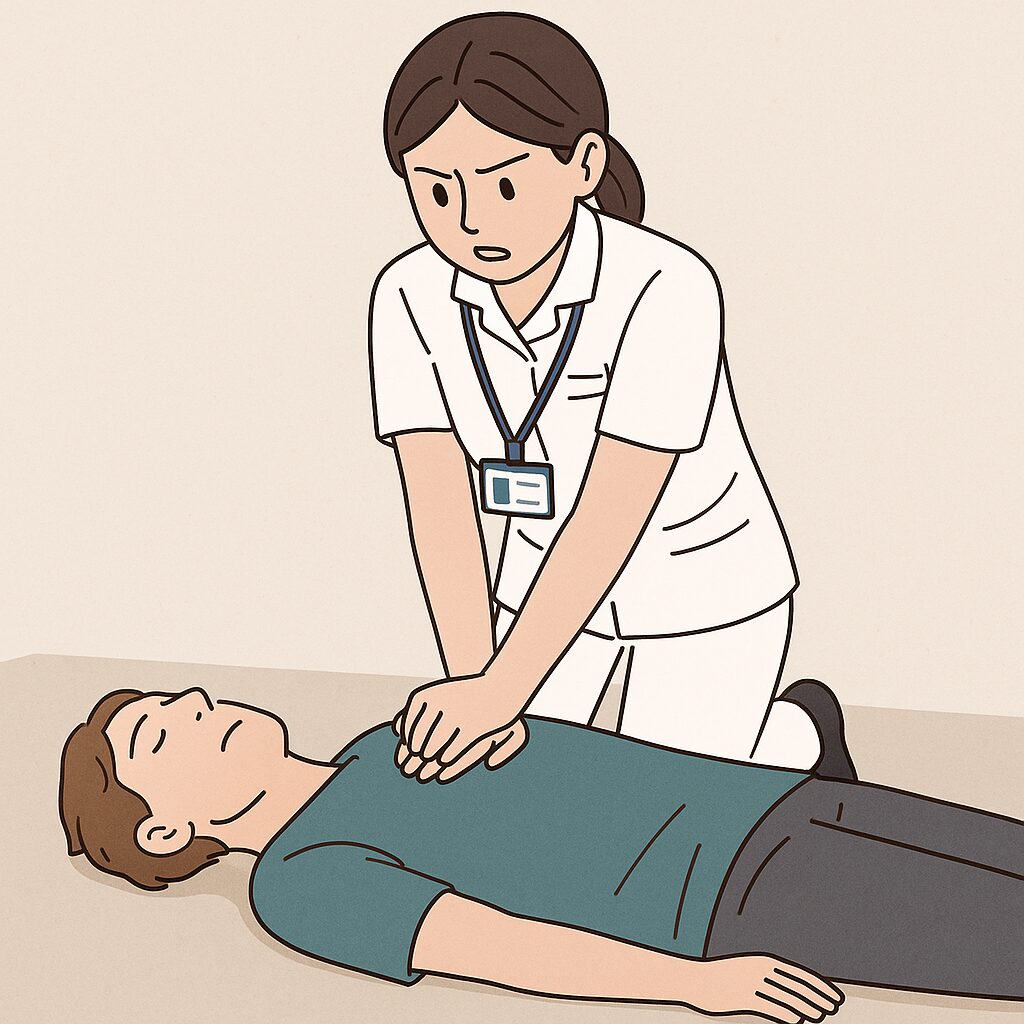 判断と行動:すぐに人を呼んで、BLSと言われる心肺蘇生を始めましょう!!