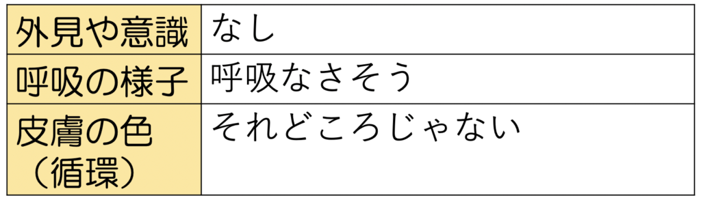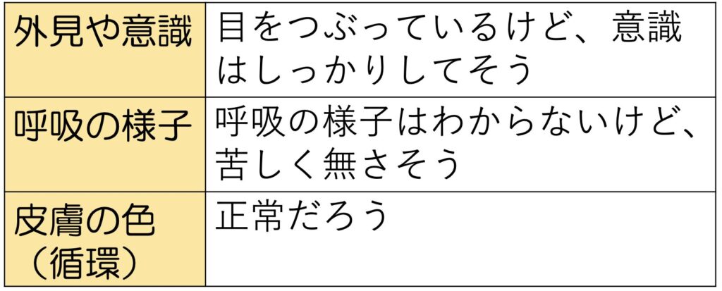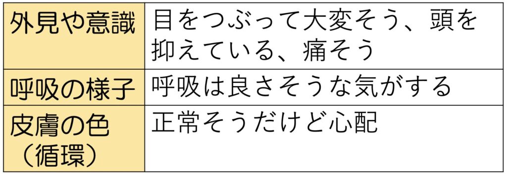 判断と行動:ショックのような感じはないけど、頭を痛がっててかなり心配、このまま近づいて観察するのと、念の為先輩に一言言っておこう(次の記事から、本格的に観察ABCDEについて解説していきます)