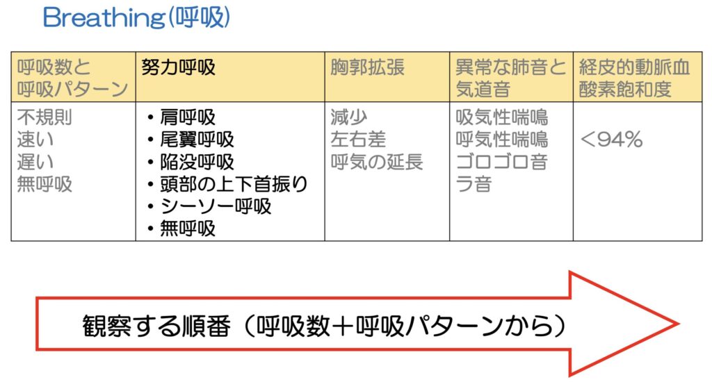 「呼吸回数と呼吸のパターン」→「努力呼吸」と観察していきます